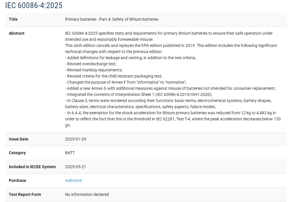 2025年1月29日,IECEE官方正式发布纽扣锂电池安全检测标准IEC 60086-4:2025,2025年5月21日,IECEE官方正式将此标准纳入系统。