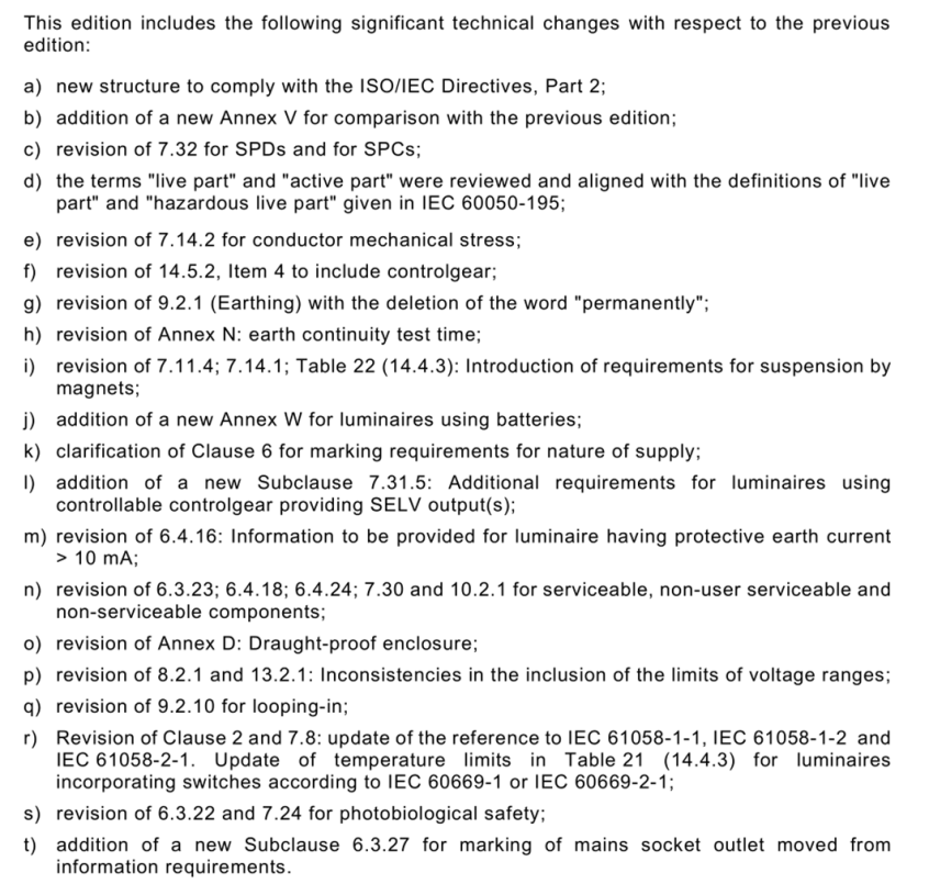 2024年11月6日,IEC发布了新版灯具标准IEC 60598-1:2024,此版本基于2020版,主要有如下重大变更: