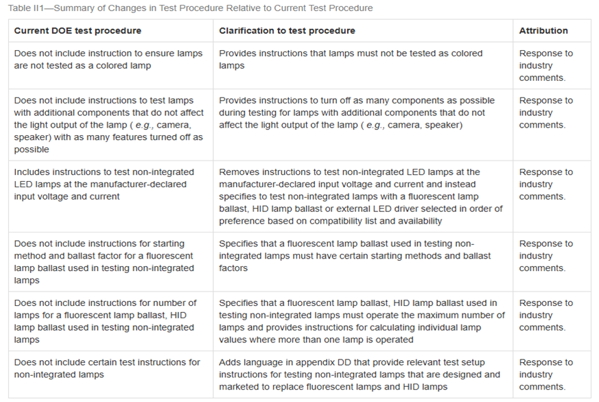 DOE至少每7年评估一次不同产品的测试程序,以确定修改后的测试程序是否更准确的符合实际要求,在技术上是否可行、在经济上是否合理。在此次的《联邦公报》最终规范中,针对通用照明灯泡(GSLs)测试程序,DOE 对Subpart B of Part 430中的appendix W, appendix BB和appendix DD测试方法提出最终说明。