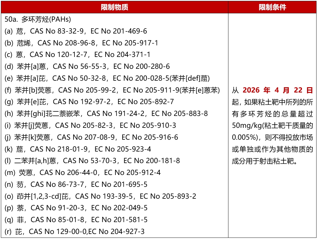 2025年4月2日,欧盟在其官方公报发布法规(EU) 2025/660,修订REACH法规((EC) No 1907/2006)附录XVII,新增50a项有关限制在射击用粘土靶中使用多环芳烃(PAHs)的条款,该条款将于2026年4月22日正式实施。