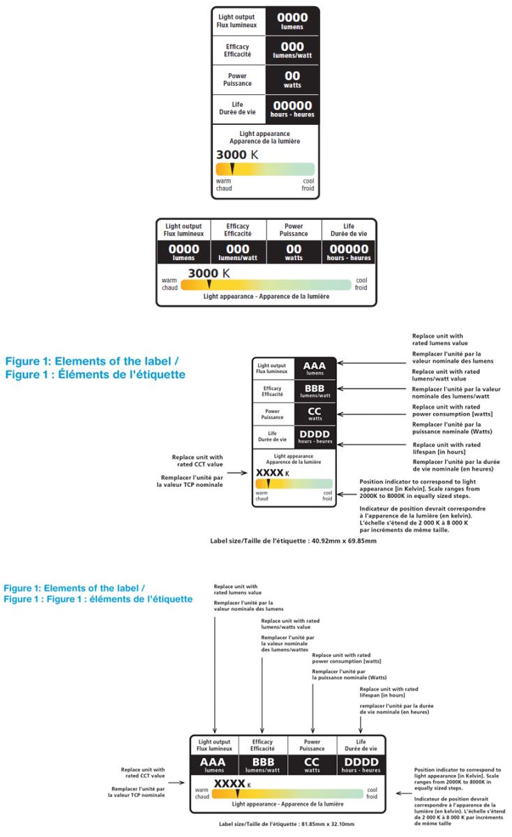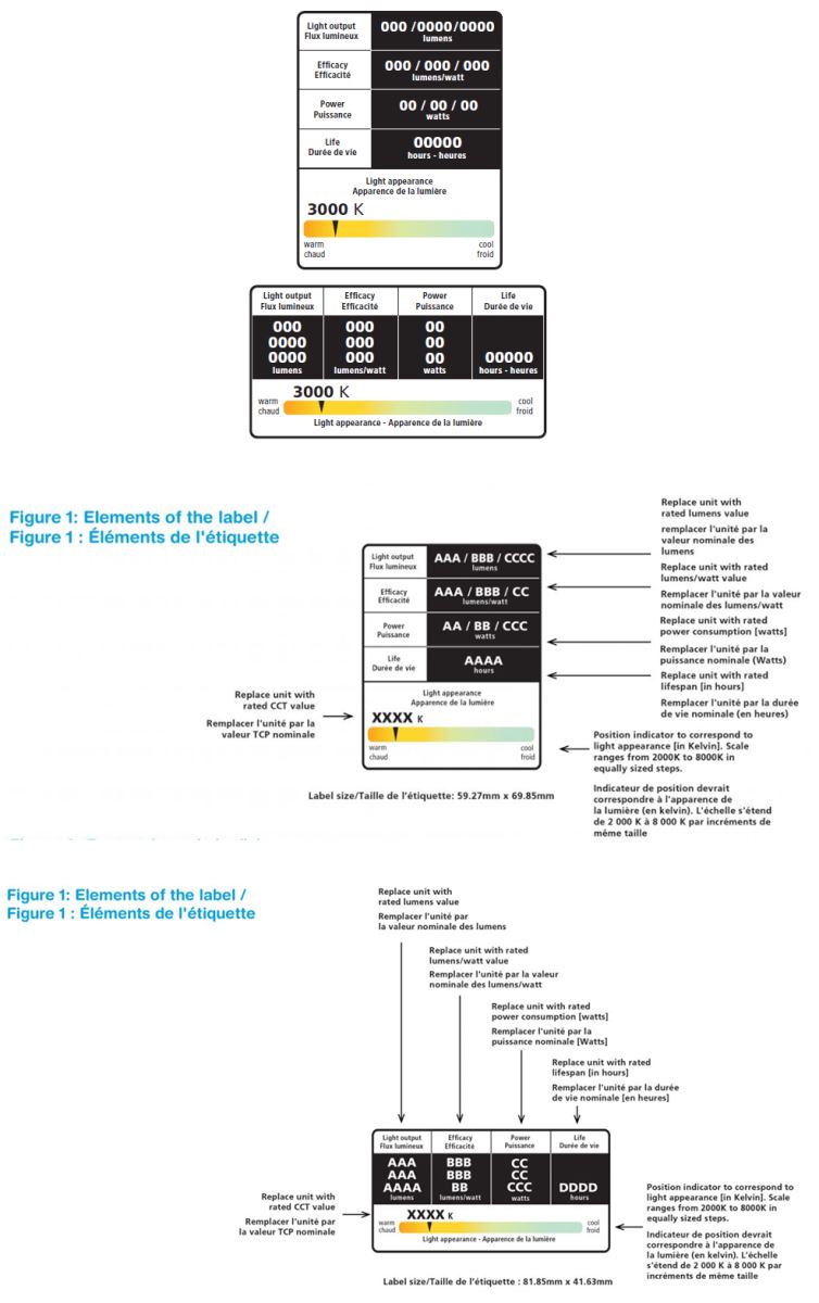 目前的标签使用灯的光效作为效率的衡量标准,它还包括以流明为单位的光输出,而不是传统上使用的瓦数,作为亮度的衡量标准。新能效标签将向加拿大消费者提供经过验证的可靠信息,并确保商品的性能符合规定要求。由于所有制造商都必须为在加拿大销售的照明商品提供法语/英语双语标签,因此美国和加拿大的标签始终存在差异,所有不考虑美国FTC标签一致性。