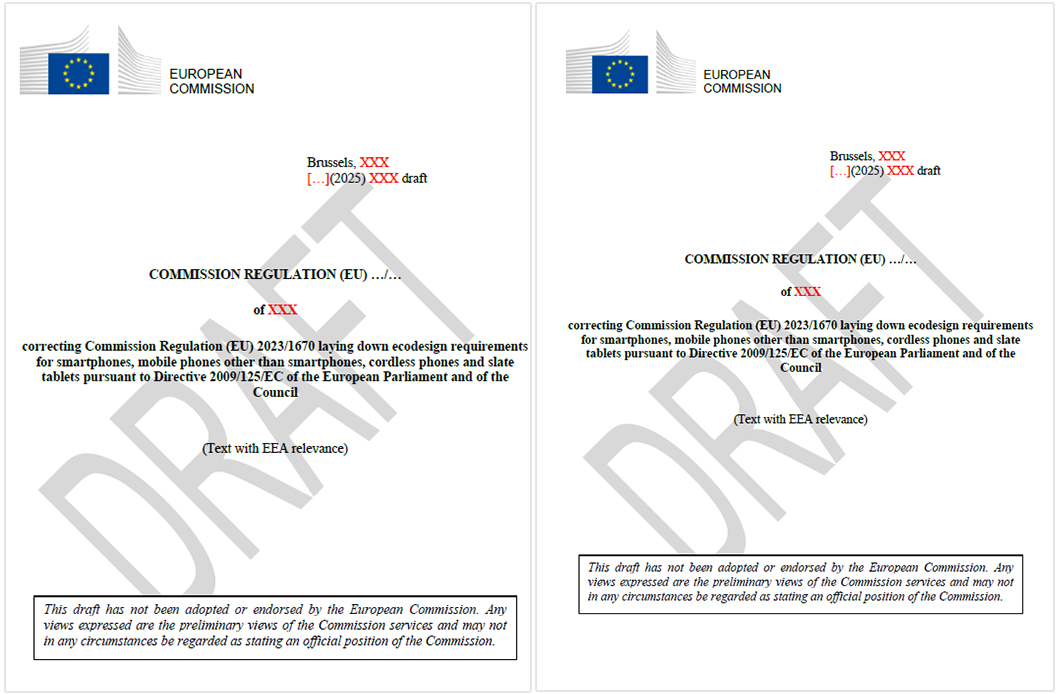 2025年4月15日,欧盟通报修正委员会条例(EU) 2023/1670的委员会条例草案,该条例根据欧洲议会和理事会的指令2009/125/EC规定了智能手机、智能手机以外的移动电话、无绳电话和平板电脑的生态设计要求。