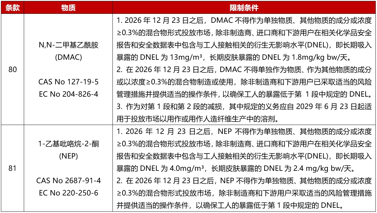 2025年6月3日,欧盟在其官方公报上发布法规(EU) 2025/1090,在欧盟REACH法规(EC) No 1907/2006附录XVII中增加第80条和第81条,分别限制投放欧盟市场的物质和混合物中的N,N-二甲基乙酰胺(DMAC,CAS号:127-19-5)和1-乙基-2-吡咯烷酮(NEP,CAS号:2687-91-4)。该修订将于2025年6月23日生效,并将于2026年12月23日后执行。