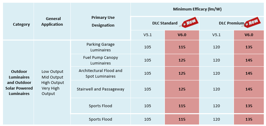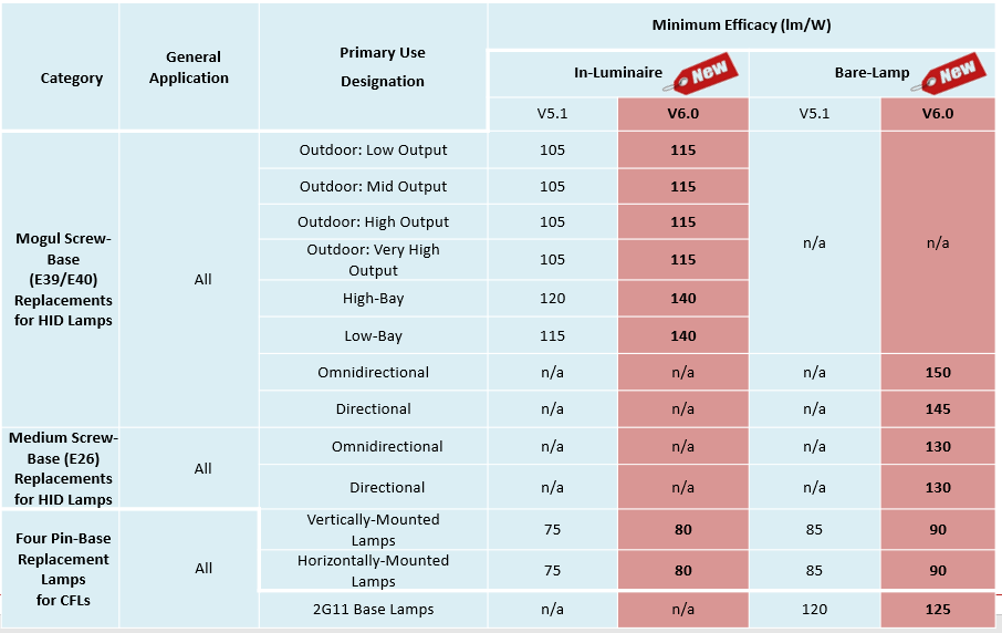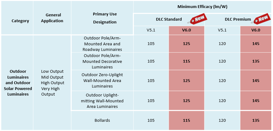 • 光效阈值提升,并引入按主要用途指定 (PUD) 划分的户外功效阈值,而不是对所有户外产品使用单一的通用光效阈值