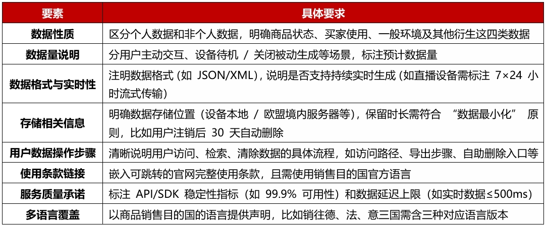 2026 年 9 月 12 日起,互联产品和相关服务的设计需默认向欧盟用户开放数据。用户可免费、便捷且安全地获取结构化、机器可读格式的数据,也可授权第三方共享数据,但被《数字市场法案》列为 “守门人” 的大型平台除外。B2C 场景下数据访问和共享全程免费,B2B 场景中数据持有者可收取合理费用。同时,数据持有者仅需共享原始数据和预处理数据,深度加工后的派生数据无需共享。