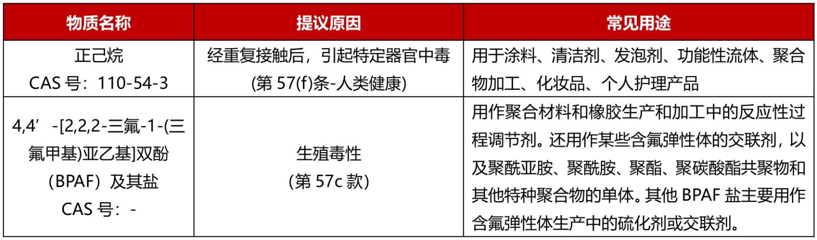 2025年12月15日,欧洲化学品管理局(ECHA)成员国委员会(MSC)12月会议一致同意将正己烷(n-hexane)列为高度关注物质(SVHC),这是首个因神经毒性(而非致癌、致突变、生殖毒性等传统类别)而被认定为列入SVHC候选清单的物质。另外, 4,4'-[2,2,2-三氟-1-(三氟甲基)亚乙基]双酚(BPAF)及其盐在未经委员会讨论的情况下被一并列入SVHC候选清单。ECHA计划于2026年2月将这2项物质列入SVHC清单,届时REACH SVHC清单将正式增至253项。