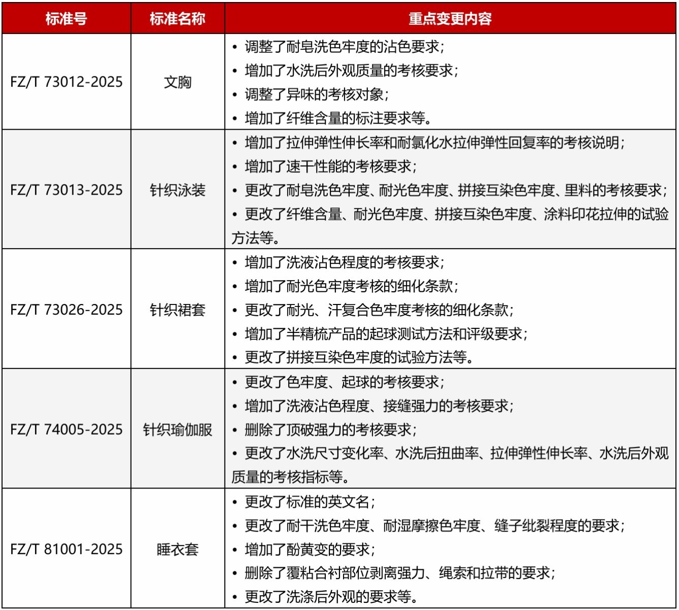 2025年12月,中华人民共和国工业和信息化部发布了一批纺织品、服装及相关产品的检测方法与执行标准的新版本。新版本2028年开始实施,在实施日期前的两年多过渡期内,新旧版标准可并行使用。主要内容汇总如下: