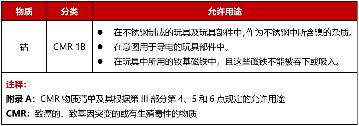 2026年1月29日,欧盟委员会发布指令(EU) 2026/192,修订玩具安全指令2009/48/EC的附件II附录A,增加了特定用途钴的豁免。该修订从2026年2月18日起生效,并从2026年8月29日起执行。