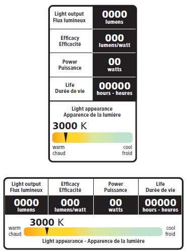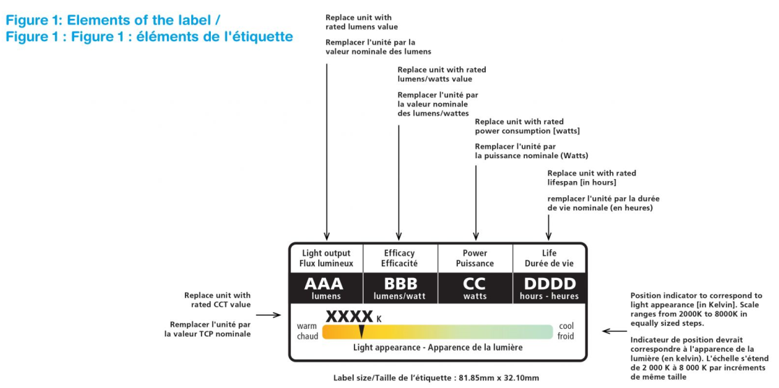新标签将向加拿大消费者提供经过验证的可靠信息,并确保商品的性能符合规定要求。由于所有制造商都必须为在加拿大销售的照明商品提供法语/英语双语标签,因此美国和加拿大的标签始终存在差异,所有不考虑美国FTC标签一致性。