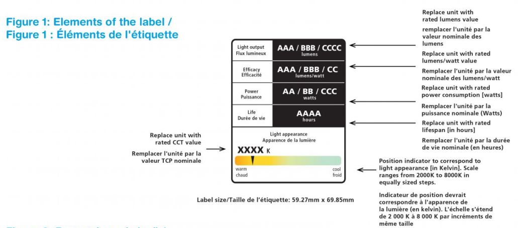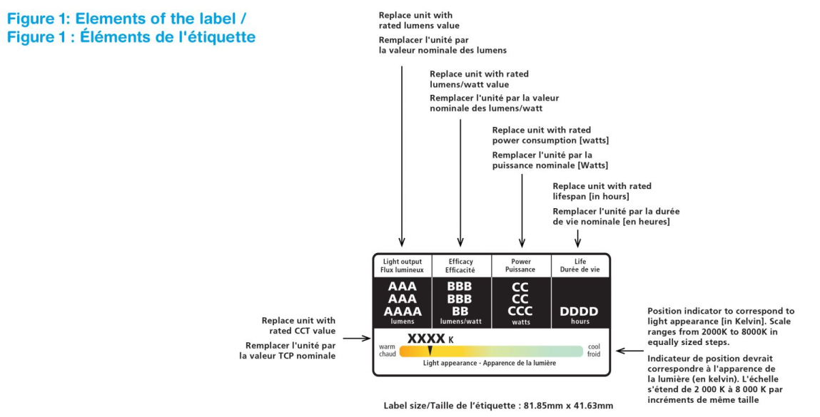 所有2027年1月1日或之后生产的的通用照明灯泡General service lamp,NRCan对其实施新的标签要求,目前的标签使用灯的光效作为效率的衡量标准,它还包括以流明为单位的光输出,而不是传统上使用的瓦数,作为亮度的衡量标准。