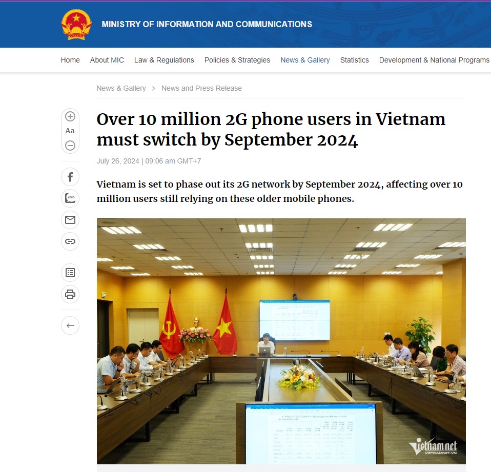 越南信息和通信部 (MIC) 于 2024 年 7 月 24 日与电信公司举行会议,讨论即将关闭的 2G 网络。当时,越南的 2G 用户总数超过 1000 万。除非电信公司在 2024 年 9 月之前提出终止使用 2G GSM 技术的设备服务的计划,否则 MIC 不会重新分配 900 MHz 和 1800 MHz 频段。MIC 鼓励当前的 2G 用户在 2024 年 9 月 16 日截止日期之前改用智能手机。