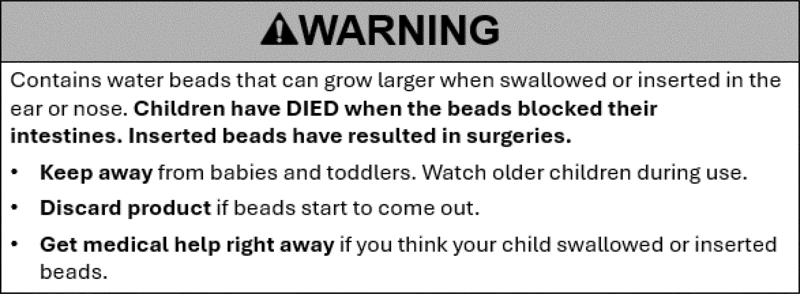 - 吸水珠玩具、吸水珠玩具的包装以及吸水珠容器须包含以下警告:
