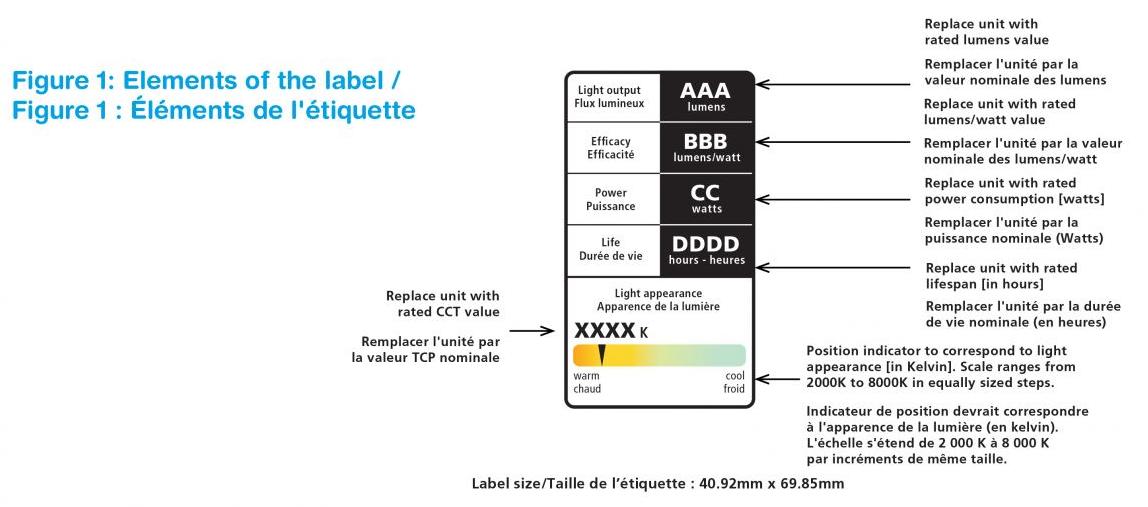 所有2027年1月1日或之后生产的的通用照明灯泡General service lamp,NRCan对其实施新的标签要求,目前的标签使用灯的光效作为效率的衡量标准,它还包括以流明为单位的光输出,而不是传统上使用的瓦数,作为亮度的衡量标准。