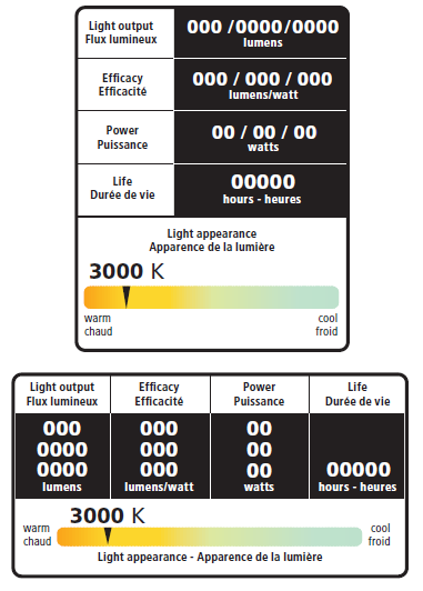 新标签将向加拿大消费者提供经过验证的可靠信息,并确保商品的性能符合规定要求。由于所有制造商都必须为在加拿大销售的照明商品提供法语/英语双语标签,因此美国和加拿大的标签始终存在差异,所有不考虑美国FTC标签一致性。